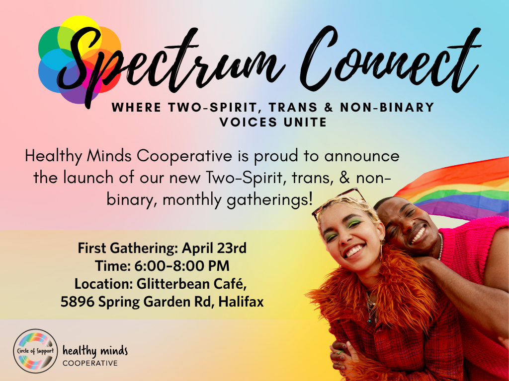 6 – 8pm | Glitter Bean Café, 5896 Spring Garden Rd, HalifaxSpectrum Connect is a monthly, community-driven gathering space for Two-Spirit, trans, and non-binary folks (18+) to connect, share, learn, and support one another. Our monthly get-togethers are designed to reduce isolation, share resources, and uplift community voices. Whether you’re just beginning your journey or have years of lived experience, you belong here.