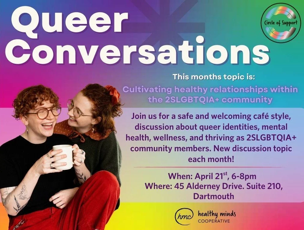 6 - 8pm | 45 Alderney Dr. Suite 210, DartmouthJoin us for a relaxed, world café–style gathering for the 2SLGBTQIA+ community to connect, reflect, and support one another. Every second month at Healthy Minds Cooperative, we’ll explore meaningful conversations around queer identity, mental health, wellness, and thriving in our communities. Come share, listen, or simply be in community.